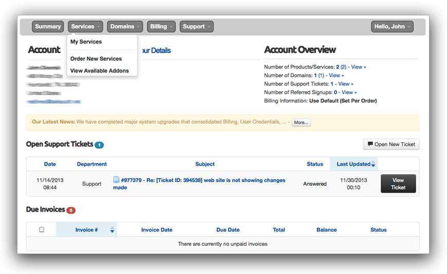Your Account Portal lets you securely manage your Billing and Orders, View Services, View Support History, Manage your Domain(s), View or Modify your cPanel server credentials or add Authorized Users and assign their permissions.