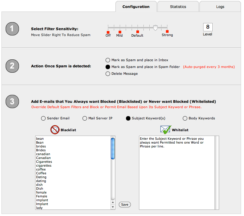 Our Custom Spam and RBL Interface within our CAS® theme makes it easy for you to manage your mail server filter sensitivity and actions once spam is detected. New Custom Filters permit you to Whitelist emails you never want blocked and Blacklist stubborn emails that get past the normal filters by email address, Mail Server IP, Subject Key Word or Mail Body Key word or Phrase.