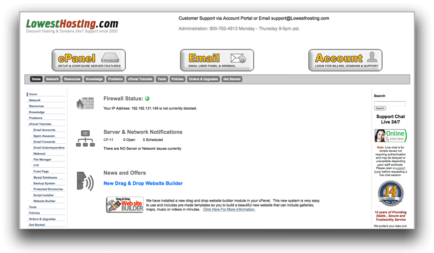 Your client area displays News, Network & Server Status, Firewall Status contains Tutorials, Knowledge Base, Tools, Resources, Problem Solver and permits Firewall Self Unblock all without login. It displays the cPanel & Email Server and Account Portal which do require login.